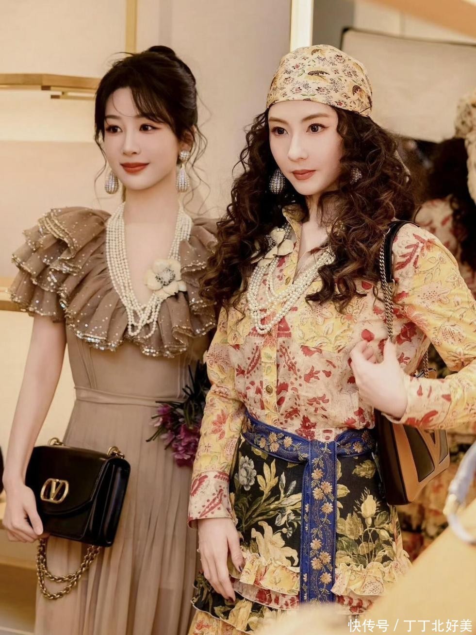 链条包包可以背在肩膀,也可以拎手上、跨手腕。金色链条看着相称贵气,刚好裙子面料颜料中有黄色,进而酿成了呼应。